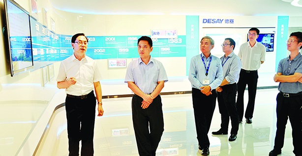 8月15日,惠州市委副書記黃志豪一行在仲愷區委書記吳獻民陪同下,蒞臨德賽調研,受到了德賽集團總裁姜捷、德賽西威董事長陳春霖的熱情接待。