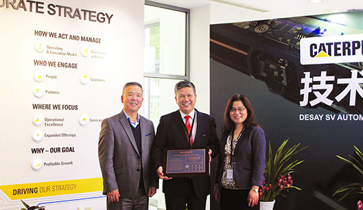 卡特彼勒技術研發(中國)有限公司董事長兼總經理尚爾兵博士(左)、卡特彼勒生產系統Nancy Jiang女士(右)與德賽西威副總經理Azmoon Ahmad先生(中)在授牌儀式上合影