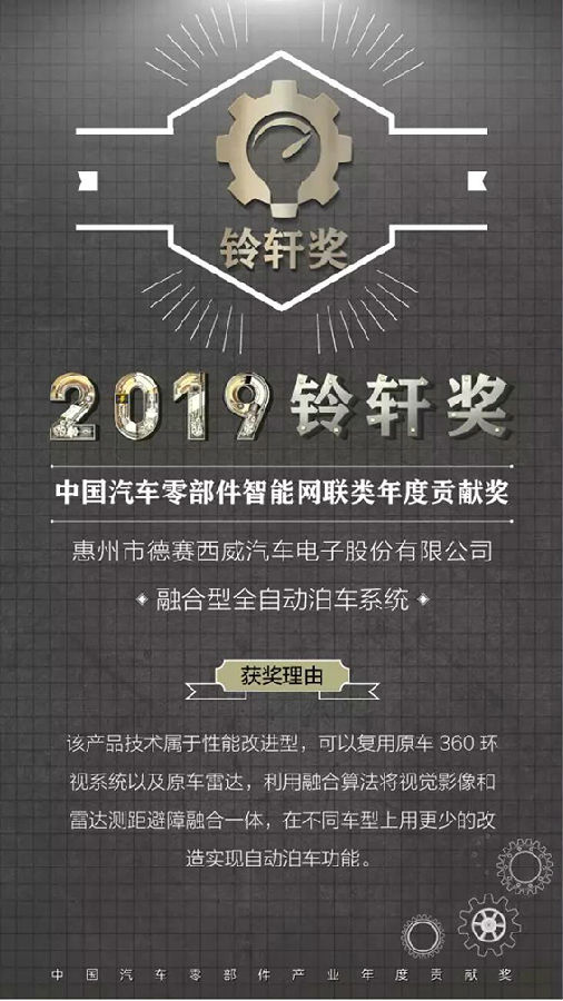 10月17日,中國汽車零部件產業發展閉門座談會在北京北汽研發基地舉行,會后舉辦了“2019第四屆鈴軒獎盛典”活動,為中國汽車零部件行業的優秀分子和新生先進力量頒獎。經過三個月的征集、討論、評審等環節,德賽西威最終從眾多企業中脫穎而出,憑借“融合型全自動泊車系統”榮獲“2019鈴軒獎-智能網聯類零部件年度貢獻獎”。
