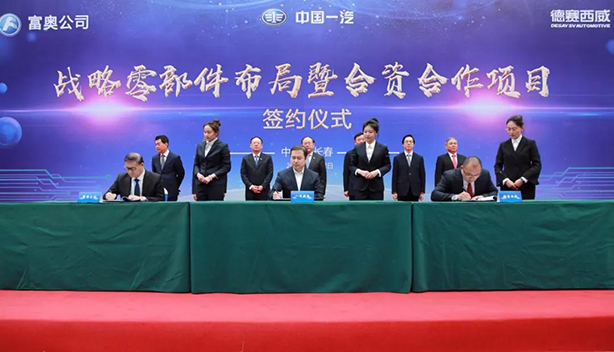 一汽股權董事長張影、富奧公司總經理甘先國、德賽西威總經理高大鵬代表三方共同簽署合資協議。長春市副市長王海英,一汽集團總經理奚國華、副總經理邱現東,一汽集團總經理助理采購部長張丕杰,吉林省國有資本運營有限責任公司董事長張志新,廣東德賽集團董事長、總裁姜捷,德賽西威董事長陳春霖等相關領導出席了簽約儀式。