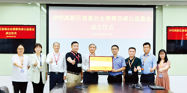 8月13日,仲愷高新區慈善總會德賽西威公益基金(以下簡稱:德賽西威公益基金)在惠州成立。社會事務局副局長、區慈善總會常務副會長王東,社會組織黨委副書記、區慈善總會執行副會長孫孟龍,區慈善總會秘書長李耀輝及惠州本地媒體到場見證。德賽西威董事長陳春霖、高級副總裁楊勇、高級副總裁譚偉恒等出席活動。