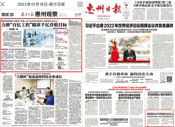1月18日,南方日報、南方網、惠州日報、網易新聞等眾多媒體廣泛關注德賽集團2021年經營業績。南方日報當天頭版頭條刊發題為《德賽集團搶抓“雙循環”機遇,去年啟用兩大新項目、營收超330億元》的報道,惠州日報同時頭版刊登文章《德賽集團去年營收超330億元 搶抓“新能源+智能汽車”機遇 厚植新優勢積蓄新動能》。報道指出,根據德賽集團統計口徑數據顯示,去年德賽集團實現營業收入331.85億元,同比增長8.77%;利潤總額18.82億元,同比增長46.22%。2021年,德賽集團搶抓機遇,加大投資,加快發展,取得了亮眼的業績表現,創歷史新高。